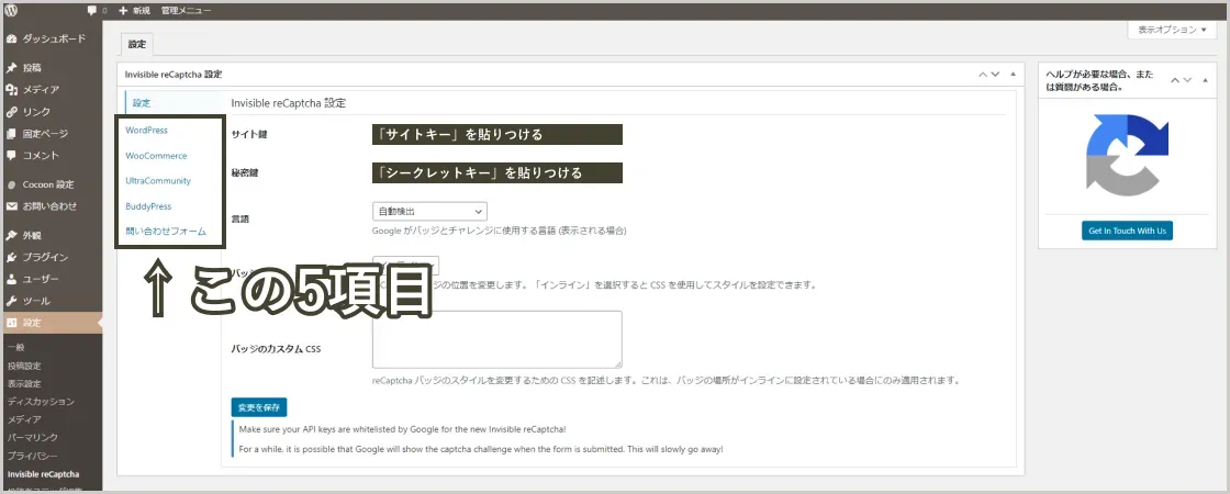 ワードプレスに戻り、ダッシュボードの「設定」から「Invisible reCaptcha」を選択します。